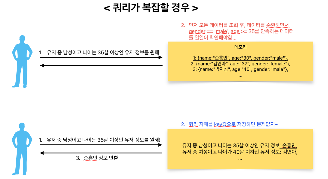 하지만 쿼리 자체가 복잡하다고 가정해봅니다. 나이가 10살 이상 15살 미만이고, 남성이며 몸무게는 50kg 이상이고 ... 이런 식으로 굉장히 많은 조건이 붙었다고 가정합니다. 그럼 여기서는 어떻게 해당 값을 바로 조회할 수 있을까요? 만약 바로 위에서 설정한 방식으로 메모리에 유저 정보가 존재한다면 이런 쿼리는 빠르게 동작하기가 어렵습니다. 이를 해결하기 위한 것이 바로 쿼리 캐싱이죠. 위와 같이 복잡한 조건의 쿼리를 key값으로 저장하고 이 쿼리에 대한 결과값을 value값으로 저장한다면, 해당 쿼리가 들어오면 쿼리에 대한 결과값을 바로 찾을 수 있기 때문에 성능을 향상시킬 수 있는 것이죠.