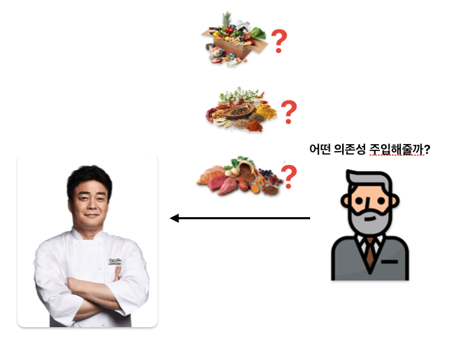 먼저 한 식당이 존재한다고 가정합시다. 여기에는 식당을 운영하는 사장과 식당에서 요리를 담당하는 요리사가 있습니다. 이때 요리사는 주어진 재료와 조리도구만을 이용해 요리할 수 있습니다. 식당은 요리사에게 재료와 조리도구를 제공하죠. 이때 문제가 생깁니다. 요리사의 자질을 평가하기 위해 요리를 시켰는데, 사장이 썩은 재료와 허접한 조리도구를 제공한 것입니다. 그러면 어떻게 될까요? 당연히 요리사가 굉장한 요리 스킬을 가지고 있을지라도 엉망인 음식이 나올 것 입니다. 그럼 요리사는 허접한 요리사일까요? 그건 또 아니죠. 아무리 결과가 엉망인 음식이라고 해도 요리사 자체는 허접하다고 볼 수 없습니다. 이런 개념이 바로 의존성 주입입니다.