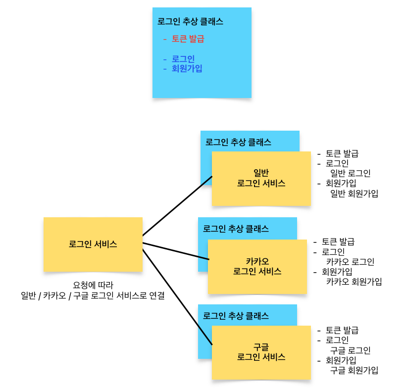 위 예시에서는 추상 클래스를 활용해 토큰 발급이라는 기능은 모든 로그인 서비스들이 가진 공통 로직으로 만들었습니다. 즉, 일반 / 카카오 / 구글 로그인 서비스 모두 같은 기능을 가진 것이죠. 하지만 각 서비스들의 세부적이 로그인 및 회원가입 로직은 다를 수 있고 해당 로직은 알아서 구현하도록 한 구조입니다.