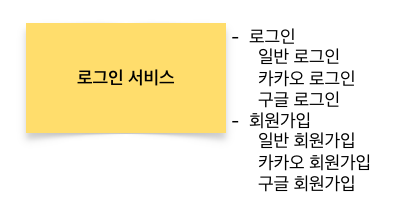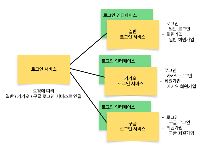 위와 같이 하나의 로그인 서비스가 여러 로그인 기능과 회원가입 기능을 구현하도록 설정했습니다. 처음에는 해당 서비스 코드가 로그인 및 회원가입이라는 하나의 역할을 담당한 하나의 객체로 설정되었으니 객체 지향 프로그래밍 관점으로 전혀 문제없다고 생각했습니다. 하지만 너무 많은 역할을 한 객체에 담당시킨 게 아닌가라는 고민이 들기 시작했습니다. 예를 들어 일반 로그인 및 회원가입을 담당하는 객체, 카카오 로그인 및 회원가입을 담당하는 객체, 구글 로그인 및 회원가입을 담당하는 객체로 쪼개면 더 좋지 않을까 싶었습니다. 그 이유는 더 세밀한 역할 분리를 위해서입니다.