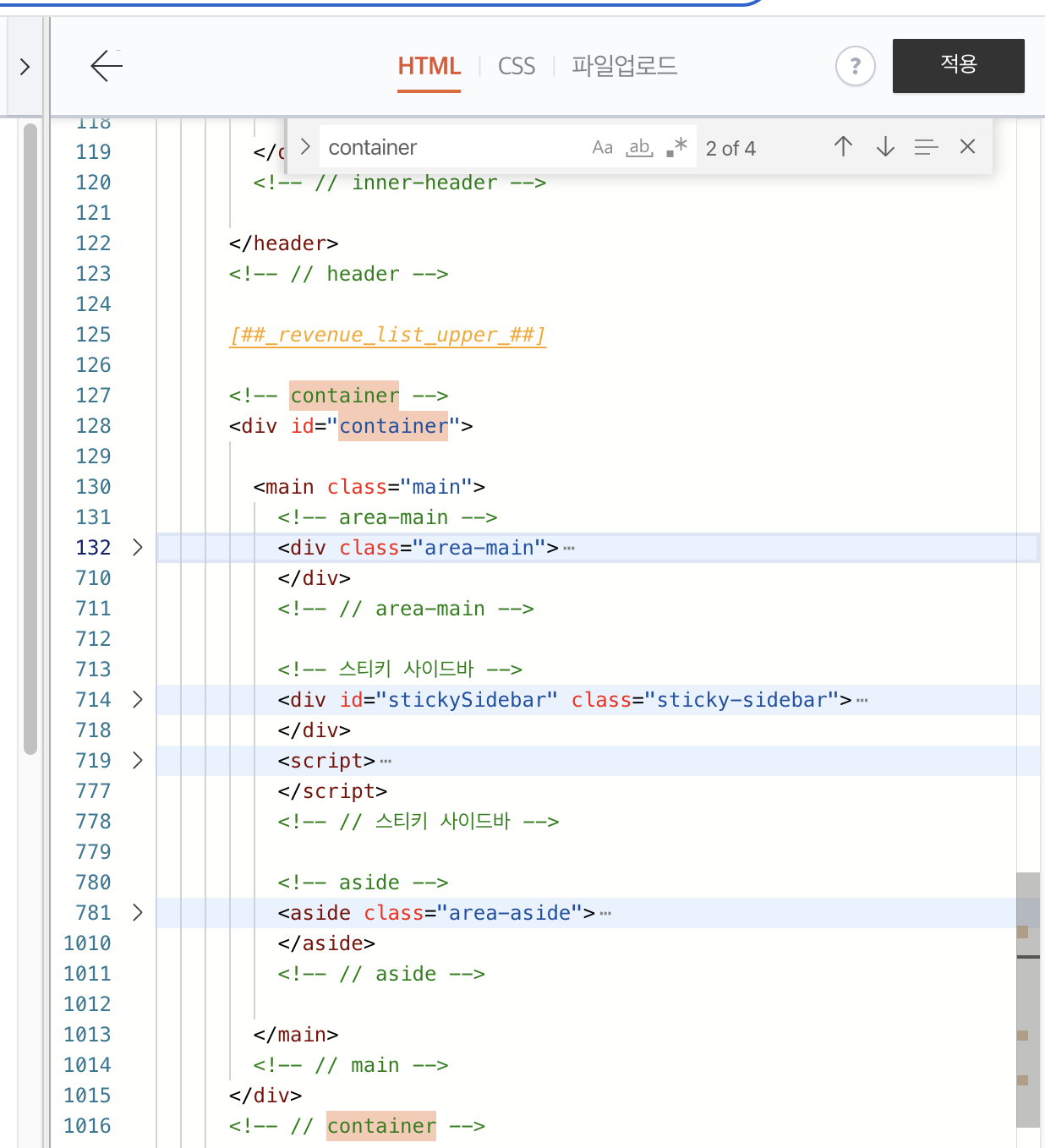 html 코드를 클릭 후 ctrl+f 검색키를 활용해 container를 검색합니다.