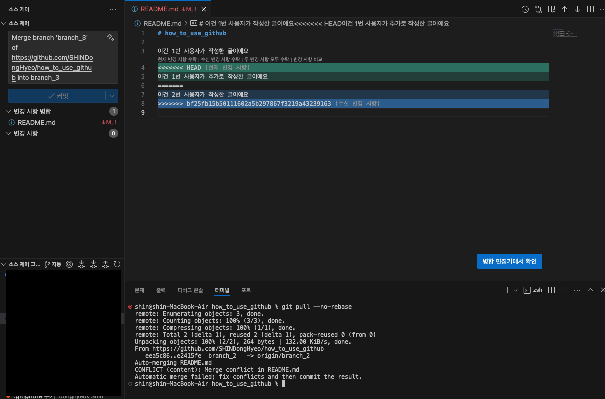 여러명의 개발자가 git에서 같은 브랜치에서 같은 소스코드에 대한 작업을 진행하다보면 병합이 필수적입니다. 이때 같은 소스코드를 수정하다보니 에러가 흔하게 발생하는데요. 이때 어떻게 대응해야하는지에 대해 알아보겠습니다.