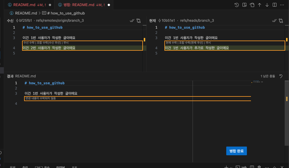 위 사진을 보면 현재 사용자인 1번 사용자가 작성한 부분은 <<<<<<< HEAD 와 ======= 사이에 존재하고