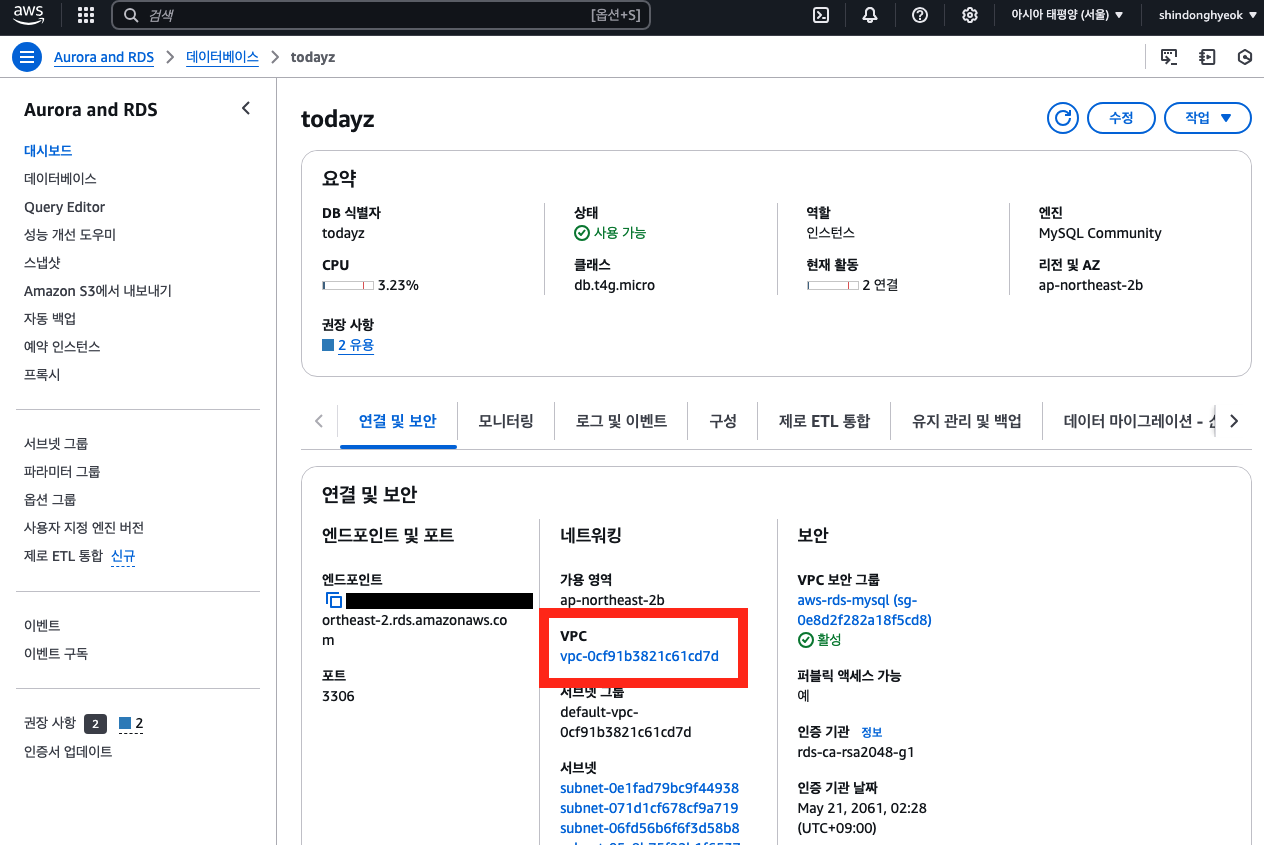 RDS 데이터베이스를 클릭해 설정된 옵션을 확인하면 위와 같이 VPC를 확인할 수 있습니다. 해당 VPC를 클릭해 세부 사항을 확인합니다.