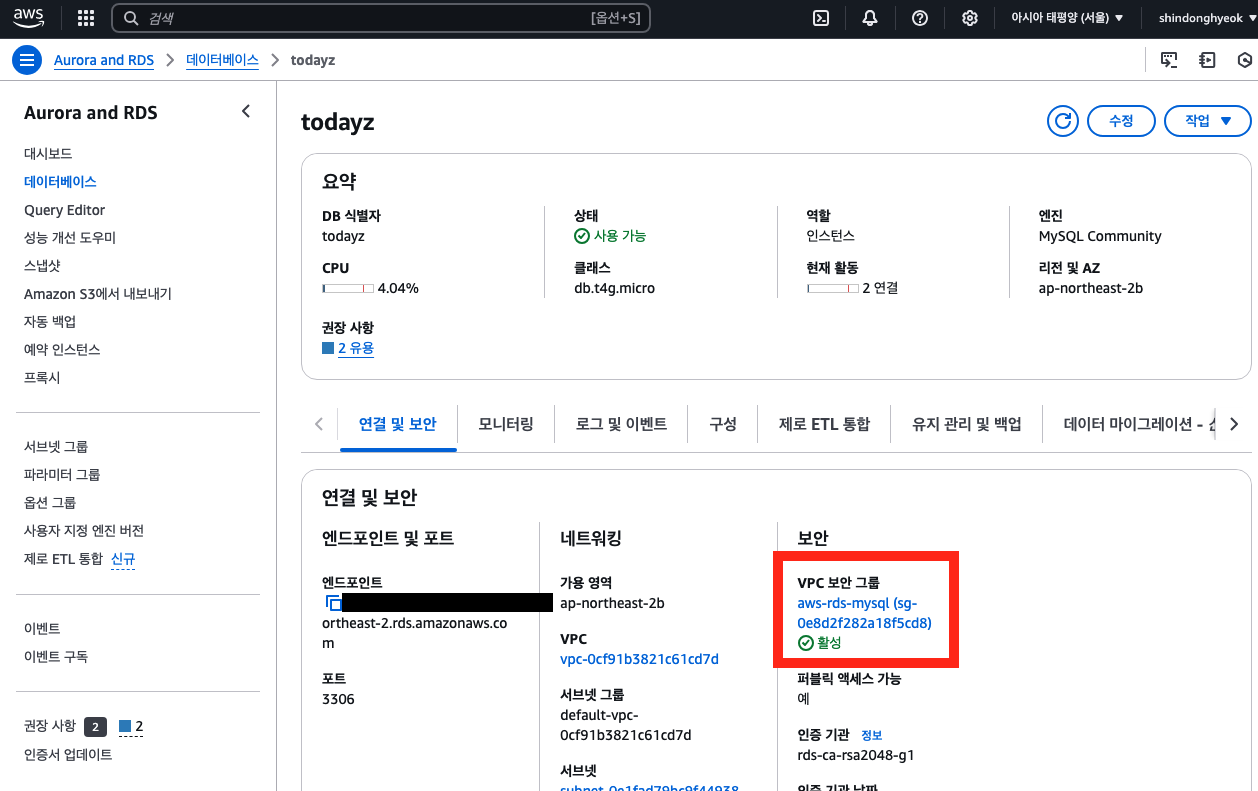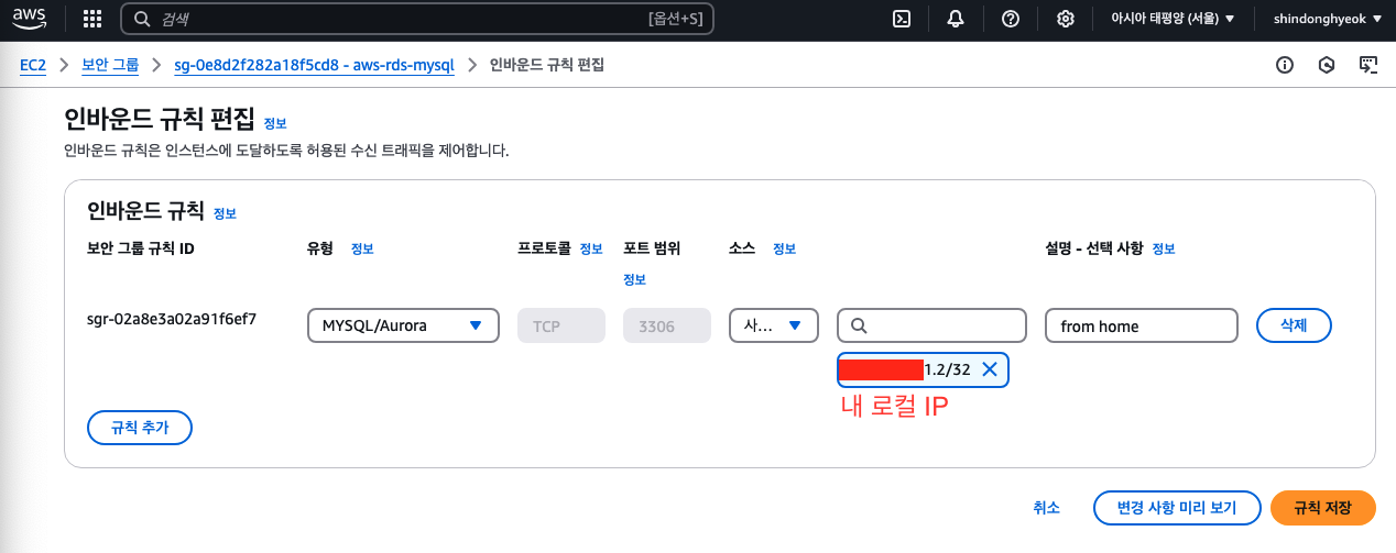 RDS 데이터베이스를 클릭해 설정된 옵션을 확인하면 위와 같이 VPC 보안 그룹을 확인할 수 있습니다. 해당 보안 그룹을 클릭해 세부 사항을 확인할 수 있는데요. 여기서 중요한 것은 인바운드 규칙입니다. 내 로컬 환경에서 RDS 데이터베이스까지의 접속을 허용해주어야합니다. 다음과 비슷한 인바운드 규칙을 추가해주세요.