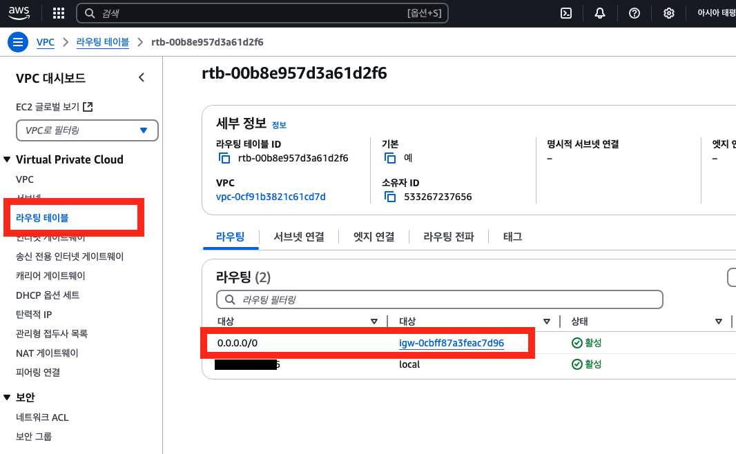 위와 같이 라우팅 설정에 다음과 같은 설정이 추가되어있어야 RDS 외부 접속이 가능합니다. 설정 내용은 다음과 같습니다. 대상: 0.0.0.0/0, 대상: 인터넷 게이트웨이(Igw-랜덤값)