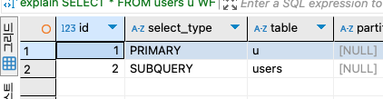 하나의 select 문에 대한 실행 계획을 확인한다면 id값이 1인 실행 계획 하나만 반환됩니다. 하지만 서브 쿼리로 select 문이 하나 더 있다면 id값이 1,2로 총 2개의 실행 계획이 반환됩니다.