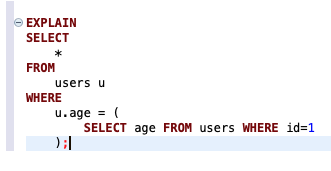 users 테이블의 age 컬럼을 통해 조회합니다. 이때 서브 쿼리문을 추가해봅니다.